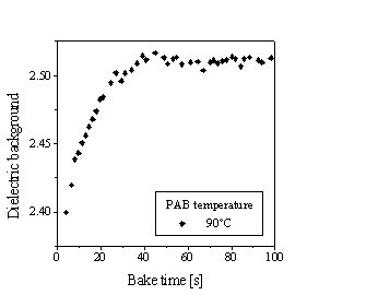 The analysis of the vibrational modes leads to an understanding of what happens chemically during the postbake step. As an example the evolution of the squared oscillator strength (which is a fit parameter of the photoresist dielectric function model) of one of the modes (carbonyl) is shown below. This quantity is proportional to the concentration of the oscillators which clearly are diminished during the process.