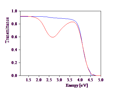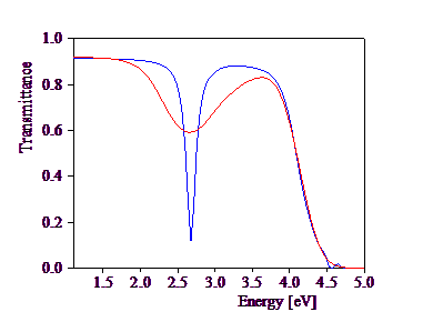 Compared to the Maxwell Garnett case much broader featues occur. This gives hope for a better agreement of measurement and model. To compute the 'Bruggeman transmission spectrum' the new Bruggeman object has to replace the former Maxwell Garnett entry in the layer stack. Recomputing the transmission spectrum you should find the following: