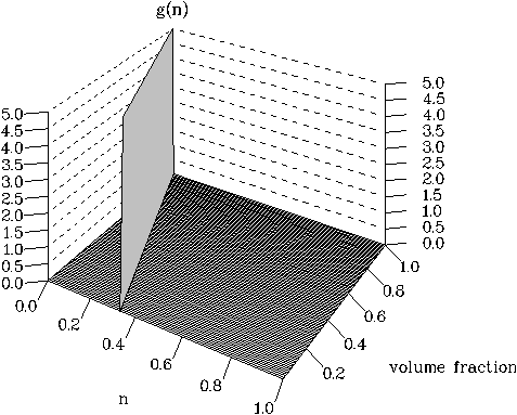 At low volume fractions the spectral density is just a single peak which rapidly broadens with increasing volume fraction. The broadening is asymmetric. At f=1/3 the left side of the peak reaches n=0. For volume fractions above 1/3 there is a non-zero percolation strength (see the technical manual for an explanation of this term) contained in the Bruggeman formula:
