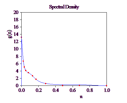 The sharp increase of the spectral density at n=0 indicates the building of connections between the islands. We could now start to work with a percolation strength different from 0. However, the value of the percolation strength can be much better investigated in the infrared and we will do that - probably - later in another tutorial.