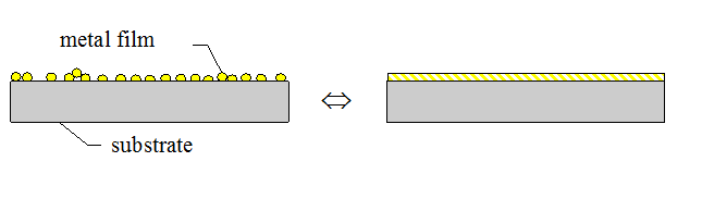 The optical properties of the silver layer can be described by a so-called effective dielectric function which is a suitable average of the dielectric functions of silver and air. But what is the 'suitable' average? The 'averaging rule' should depend on the microgeometry: If the metal islands are very far from each other there is no electric current transport in the system and the effective medium behaves like an insulator. In this case an effective medium theory should favour the vacuum component in the mixing of the two phases to the effective dielectric function. If, on the other hand, the islands would be very close to each other and metallic connections have developed already, the material will appear to the outside as a conducting metal. The effective medium would not be conducting as good as pure silver, but certainly much better than vacuum. Hence the silver dielectric function should have a significant weight in the averaging for this kind of network systems.