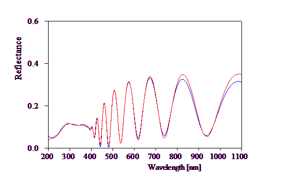 It should be noted that the reflectance fit is not perfect, especially above 800 nm. Here the measured reflectivity is higher than the simulated one. A closer inspection showed that the porous silicon layer is not homogeneous in depth but features a density gradient. To keep this tutorial as simple as possible this effect is ignored in the following.