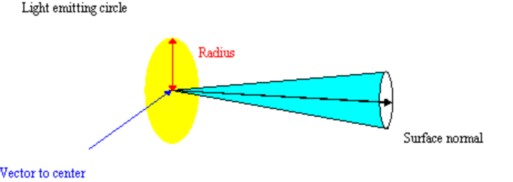 The center of the circle is defined by the 'Location' vector (blue in the sketch below). The surface normal is given by the vector called 'Ray vector' which is the black arrow. This is also the center of the emission cone. The 'Radius' parameter is the radius of the circle.