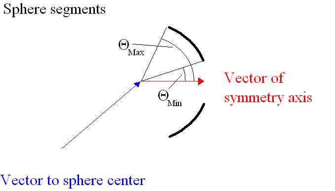 Objects of this type are sphere segments, defined by the center of the sphere, the symmetry axis and two angles ΘMin and ΘMax according to the following scheme: