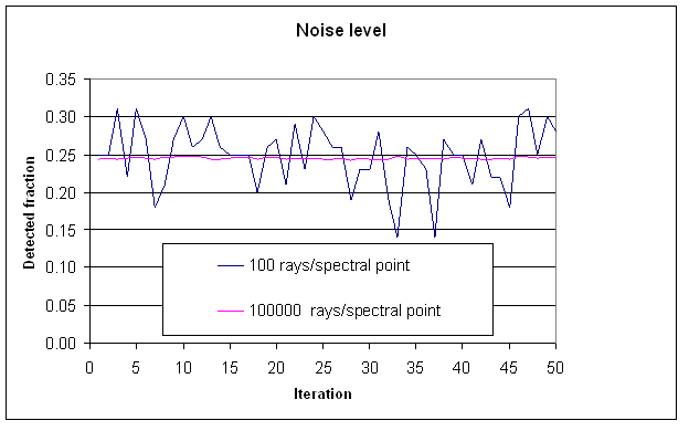 Solving problems by optical ray-tracing involves some randomness - consequently there is noise in the results. The following graph shows an example: The same SPRAY simulation has been repeated 50 times, and the chart shows the detected fraction obtained with 100 and 100000 rays: