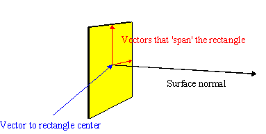 Compared to the point light source we have to set a lot more quantities to define the screen. The geometric position is defined by the center of the screen rectangle given by the x,y and z values of the 'Location' column (The blue vector in the picture below). The two other vectors (labeled 1st and 2nd) define the orientation and the size of the screen rectangle according to the following sketch: