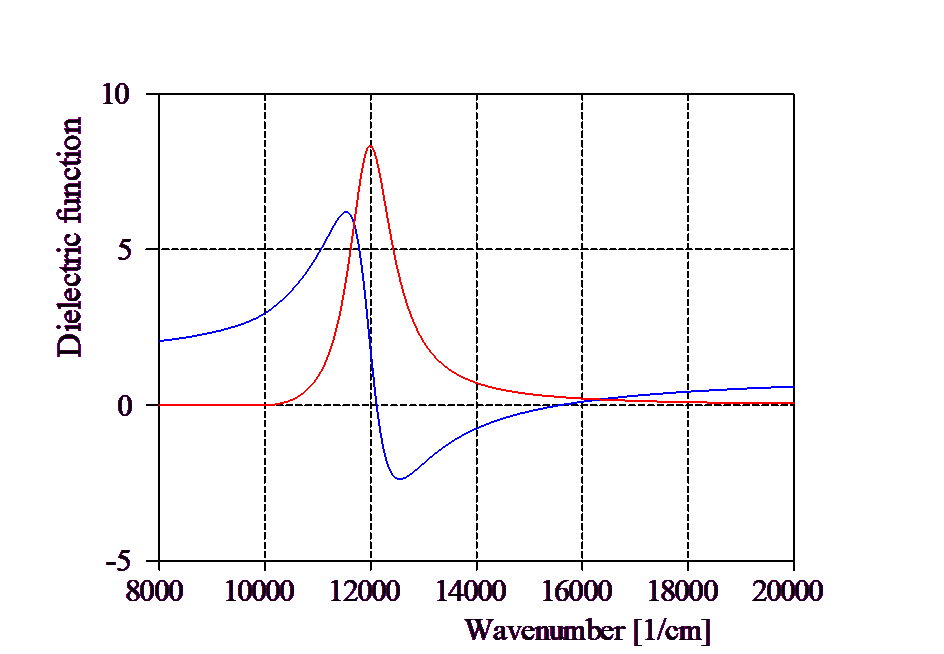 The following example shows the dielectric function obtained with this model (the parameters are those displayed in the dialog above) where a constant dielectric background of 1 has been added: