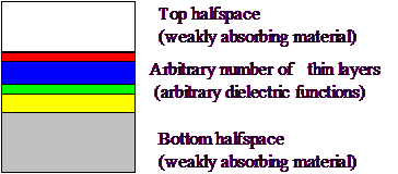 The surface of interface objects can be covered with arbitrary layer stacks. Each layer is 'filled' with optical constants taken from the list of dielectric functions. The top halfspace and the bottom halfspace should have optical constants with small absorption coefficients: