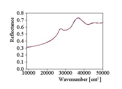 There is no restriction of the SCOUT software to the infrared spectral range, of course. The visible and the ultraviolet are covered as well, as is shown here by another silicon example. The strong electronic interband transitions in the UV (above 25000 1/cm) lead to broad 'gap features' in the UV reflectivity which can be modeled by extended harmonic oscillators ('Brendel oscillators') as shown in the next graph.